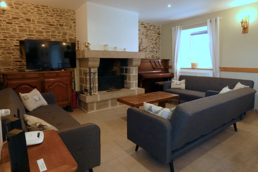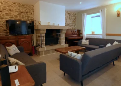 Une vaste pièce de vie avec cheminée vous accueille (possibilité de 35 personnes assises) avec, pour préparer les repas sans être coupé du groupe, un espace cuisine toute équipée (un grand four, cinq feux gaz, un micro ondes, un grand réfrigérateur, un congélateur, un lave vaisselle, un robot ménager…)
